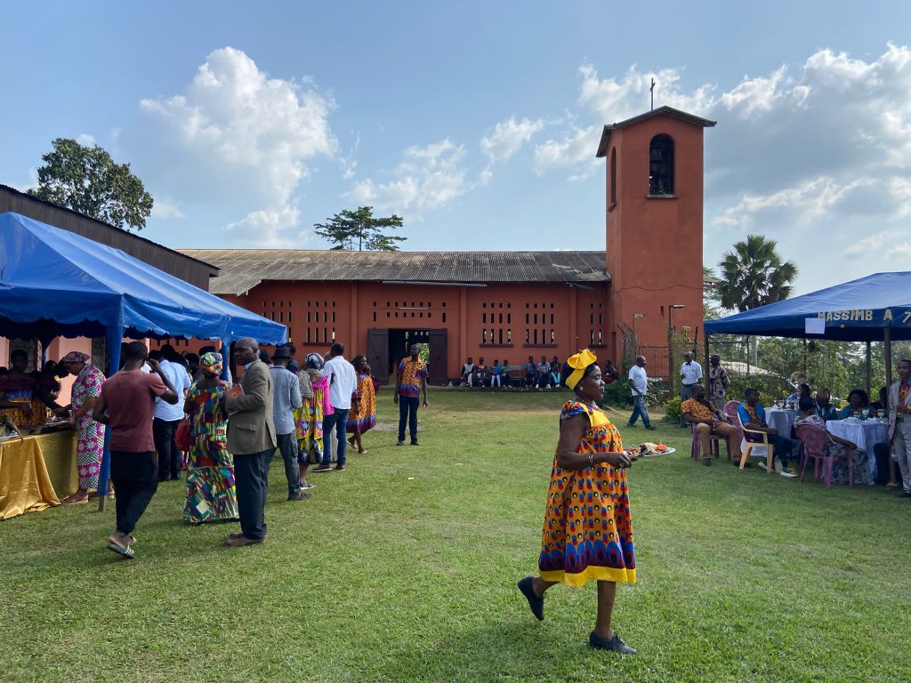Am Ende des Gottesdienstes in Otélé liegen Bananenstauden, Kartoffeln, Maniok und Mais im gefliesten Altarbereich für den Priester bereit. Pakete in Geschenkpapier, Getränkepacks und Flaschen mit lokalem Palmöl. Die gespendete Ziege wartet vor der Kirche. Ein DJ legt später vor der Kirche Musik auf, die Menschen tanzen in der Sonne, der Priester mittendrin.