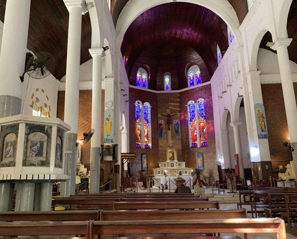 Immer samstags 18 Uhr wird es eng rund um die Kathedrale St. Pierre et Paul in Douala, der wichtigsten Wirtschaftsmetropole Kameruns. Nicht nur samstags, auch werktags rufen die Glocken zweimal am Tag zur katholischen Messe, 6.15 Uhr früh und 18.30 Uhr zum Sonnenuntergang. Oft stehen die Menschen aus Platzmangel vor dem Eingang der riesigen Kirche aus den 1930er Jahren. Von draußen sind die Gesänge des Kirchenchores zu hören. Liturgische Gesänge mit afrikanischen Rhythmen. Es wird Abendmahl gefeiert. Einige Gläubige werfen sich auf den Boden vor den Priestern. Im 19. Jahrhundert brachten Misssionare der Pallotiner aus Bayern das Christentum nach Douala, der ersten Hauptstadt der deutschen Kolonie. Gegenüber von St. Pierre et Paul liegen sie auf dem deutschen Friedhof, die Missionare. Neben deutschen Händlern und Soldaten.