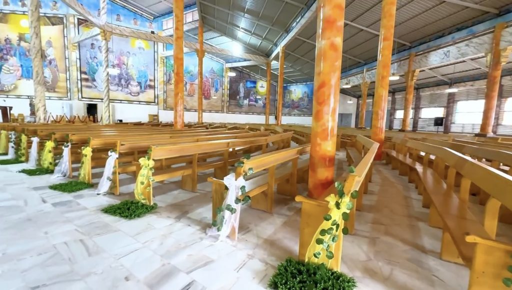 Das Innere der wellblechgedeckten Kirche – schlicht. Durch die fensterlosen Maueröffnungen hört man Hühner und Ziegen. Vor dem Altar bunte Blumensträuße. Junge Mädchen singen und tanzen barfuss zu den Trommel- und Balafonklängen.